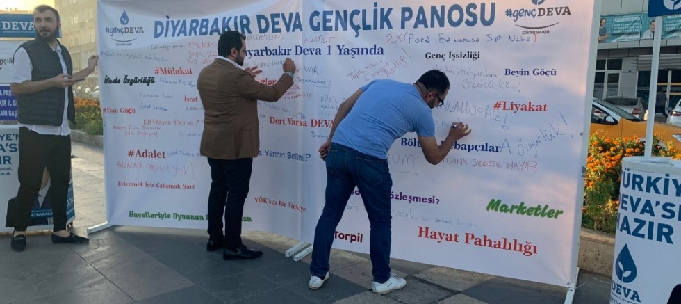 Deva Partisi Diyarbakır İl Gençlik Çalışmaları Başkanlığı, "Ülkemizin gerçek gündemi olan sorunlarımızı, geleceğe dair umutlarımızı, beklentilerimizi özgür bir ortam yaratmak amacıyla diyarbakır?ın çok yoğun ve işlek olan meydanlarından biri olan şeyh said meydanında gençlik panomuzu kurduk.