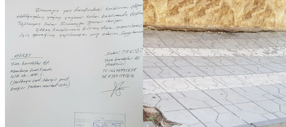 Bina Kapıcısı İbrahim Bey, "kışın yağmur suyunun birikmesinden ötürü hiçbirimiz bu kaldırımda yürüyemiyoruz. Çöküntüden ötürü binanın altına su kaçıyor. yetkililerden sorunumuza bir çözüm getirmelerini istiyoruz." dedi.