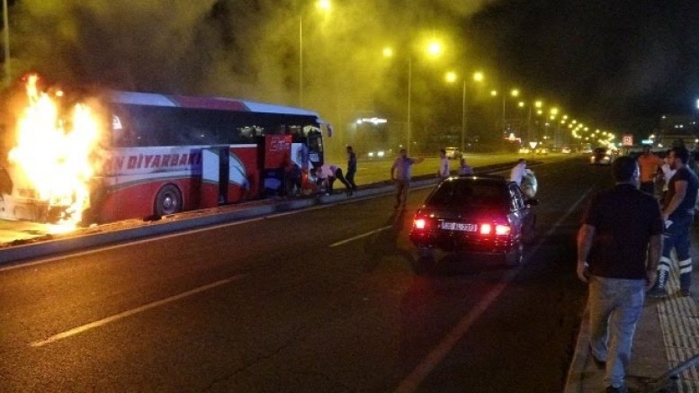 EMEK HABER- Diyarbakır`da seyir halindeki yolcu otobüsü yandı. Erken farkedilen yangında, yolcuların tahliye edilmesi olası bir faciayı önledi.