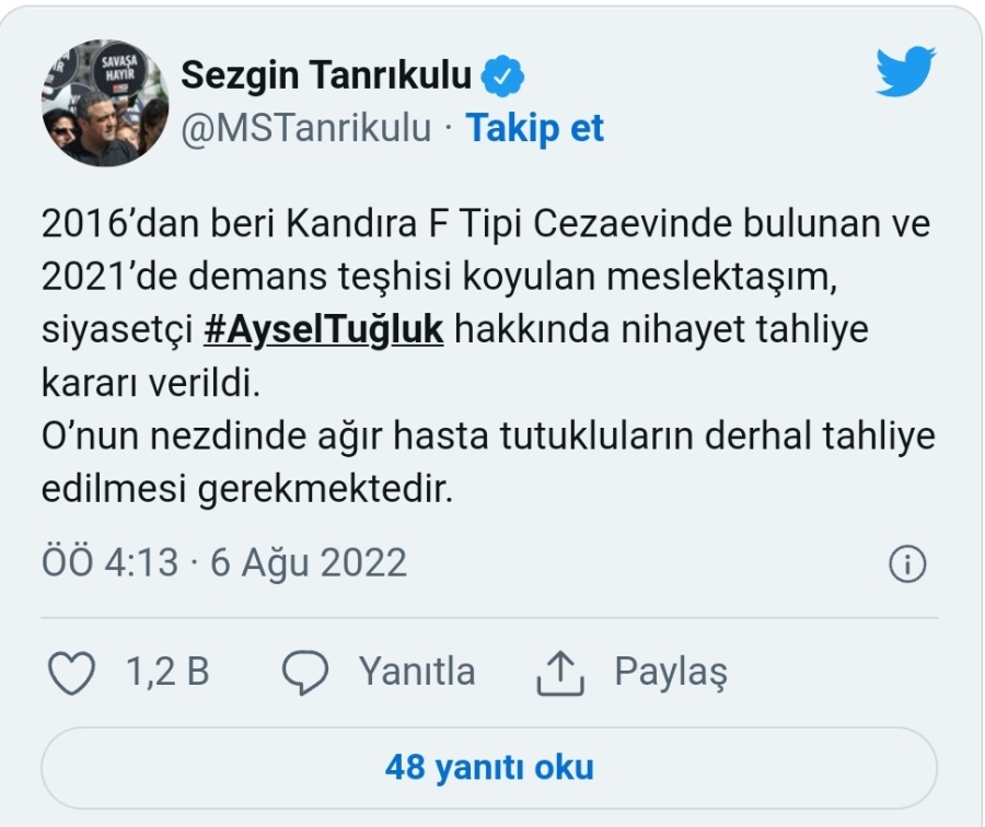 Tahliye kararını, CHP İstanbul Milletvekili Sezgin Tanrıkulu, "2016’dan beri Kandıra F Tipi Cezaevinde bulunan ve 2021’de demans teşhisi koyulan meslektaşım, siyasetçi #AyselTuğluk hakkında nihayet tahliye kararı verildi. O’nun nezdinde ağır hasta tutukluların derhal tahliye edilmesi gerekmektedir" sözleriyle duyurdu.