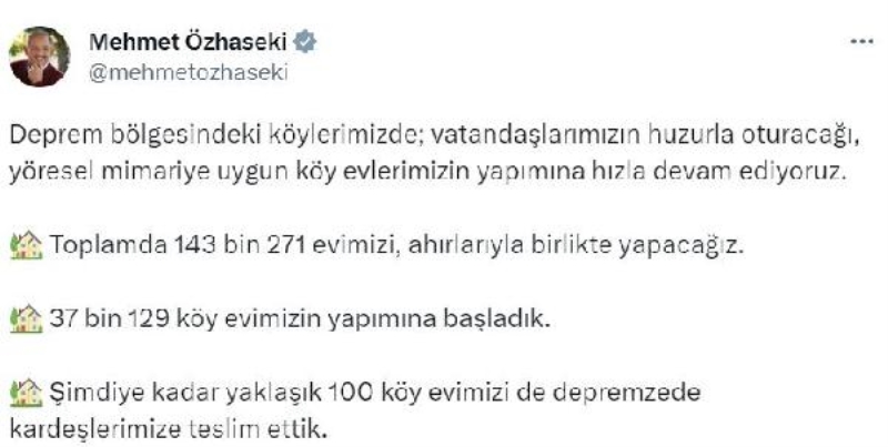 Çevre, Şehircilik ve İklim Değişikliği Bakanı Mehmet Özhaseki, Twitter'daki hesabından deprem bölgesindeki köy evlerine ilişkin video mesaj yayımladı. Bakan Özhaseki paylaşımında, "Deprem bölgesindeki köylerimizde; vatandaşlarımızın huzurla oturacağı, yöresel mimariye uygun köy evlerimizin yapımına hızla devam ediyoruz. Toplamda 143 bin 271 evimizi, ahırlarıyla birlikte yapacağız. 37 bin 129 köy evimizin yapımına başladık. Şimdiye kadar yaklaşık 100 köy evimizi de depremzede kardeşlerimize teslim ettik" dedi.