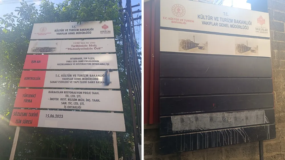 Behram Paşa Camii’nin girişinde bulunan ve işin bitim tarihine ilişkin bilgilerin yer aldığı levhanın silindiği gözlemlendi. Aynı durum Parlı Safa Camisi için de geçerli.