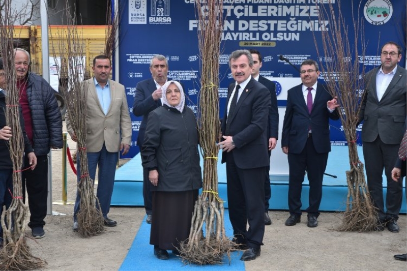 Büyükşehir Belediyesi Başkanvekili Süleyman Çelik, fidan dağıtım töreninde yaptığı konuşmada, Kırsal Hizmetler Daire Başkanlığı, Tarım Peyzaj A.Ş, BUSKİ ve HAGEL marifetiyle 4 koldan tarım için seferber olduklarını söyledi. Bugüne kadar süt toplama merkezleri, soğutma tankları, salça makinaları, tohum selektör makinaları, taşıt kantarları ceviz soyma makinaları gibi desteklerde bulunduklarını dile getiren Çelik, “Hemen bütün ilçelerimizde yaban mersini yetiştiriciliğine uygun bölgelerde 729 çiftçimize yaban mersini fidanı, ahududu fidanı, aronya fidanı, çilek fidesi, gojiberry fidanı ve lavanta fidanı teslim ettik. İhracatı artırma hedeflerimiz kapsamında B2B organizasyonları düzenliyoruz. 2023 yılı sonuna kadar 5 milyon fidan temin edeceğiz. Fidan temininin yanında çiftçilerimize gübre desteği de vermeye devam edeceğiz. BUSKİ marifetiyle bu dönem Bursa genelinde su sondajları, göletler, sulama havuzları, sulama hatları ve sistemleri yapıyoruz. Kısacası Büyükşehir Belediyesi’nin tarım destekleriyle Bursa üretiyor, Türkiye kazanıyor. Bugün dağıttığımız fidan ve yem tohumlarının da çiftçilerimize bereketli günler getirmesini diliyorum” dedi.