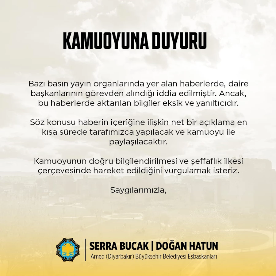 Diyarbakır Büyükşehir Belediyesi eş başkanları Serra Bucak ve Doğan Hatun, bazı daire başkanlarının görevden alındığına yönelik çıkan haberlerle ilgili açıklama yaptı.
