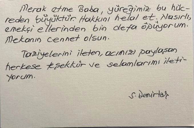 Tutuklu bulunduğu Edirne Cezaevi'nde, taziyelerini iletenlere teşekkür eden Demirtaş, mesajında"Merak etme baba, yüreğimiz bu hücreden büyüktür. Hakkını helal et" dedi.