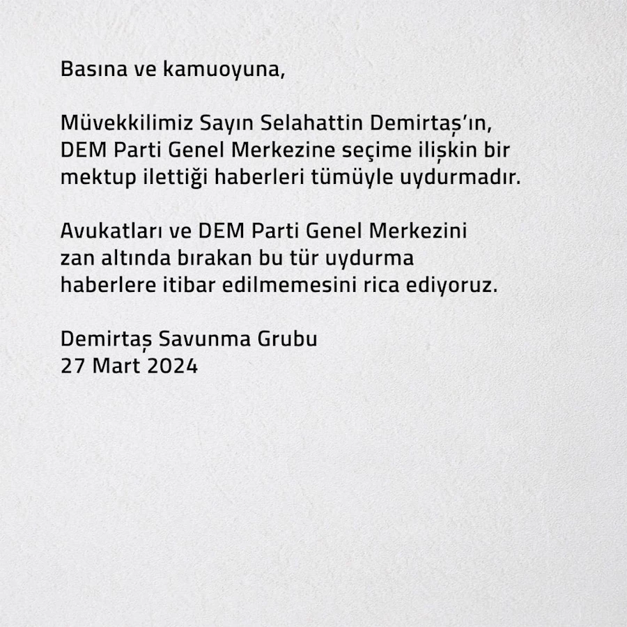 “Müvekkilimiz Sayın Selahattin Demirtaş’ın DEM Parti Genel Merkezine seçime ilişkin bir mektup ilettiği haberleri tümüyle uydurmadır.