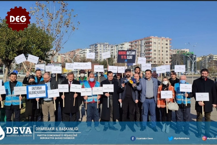 Savaş uçaklarının bomba atarak 34 kişiyi öldürdüğü Roboski Katliamı'nın 10. yılına ilişkin basın açıklaması düzenledi.Ölenlerin isimlerinin yazıldığı pankartlarla Diyarbakır'ın Kayapınar ilçesinde bulunan Roboski Parkında yapılan basın açıklaması metnini Diyarbakır Deva Partisi adına İl başkanı Cihan Ülsen okudu.Ülsen " Bu ülkenin savaş uçakları eli ile 34 insan katledildi. Ölenlerin çoğu, olay yerinde, kan kaybından ve donarak öldü" dedi.İl Başkanı Cihan Ülsen açıklamasına şöyle devam etti ;