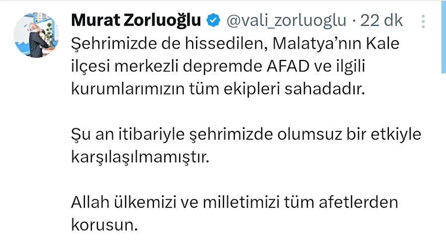 EMEK HABER- Kentte herhangi bir olumsuz durumun yaşanmadığını belirten Diyarbakır Valisi Murat Zorluoğlu, x hesabından, "Şehrimizde de hissedilen, Malatya'nın Kale ilçesi merkezli depremde AFAD ve ilgili kurumlarımızın tüm ekipleri sahadadır. Şu an itibariyle şehrimizde olumsuz bir etkiyle karşılaşılmamıştır. Allah ülkemizi ve milletimizi tüm afetlerden korusun." açıklamasında bulundu.