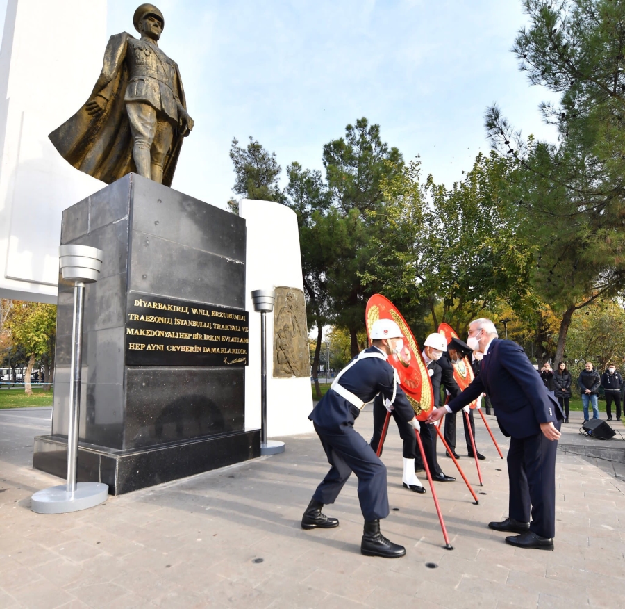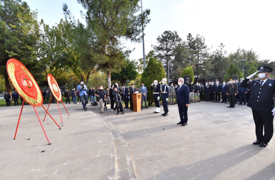 Anıtpark’ta düzenlenen tören, Vali Münir Karaloğlu tarafından Atatürk Anıtına Diyarbakır Valiliği ve Diyarbakır Büyükşehir Belediyesi çelenklerinin sunulmasıyla başladı.