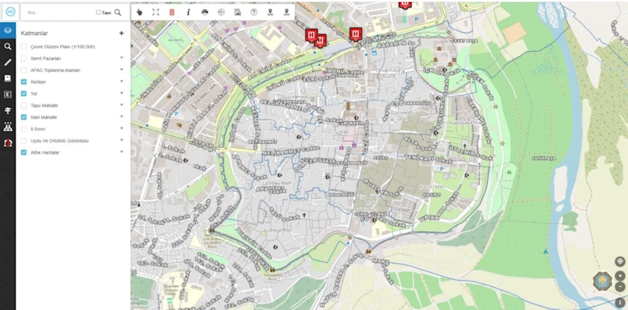 Yurttaşlar, internet tabanlı (OSM, Google, Yandex, Bing) ve uydu/ortofoto görüntü verileri gibi çeşitli harita altlıkları ile şehri daha ayrıntılı bir şekilde keşfedebilecek.