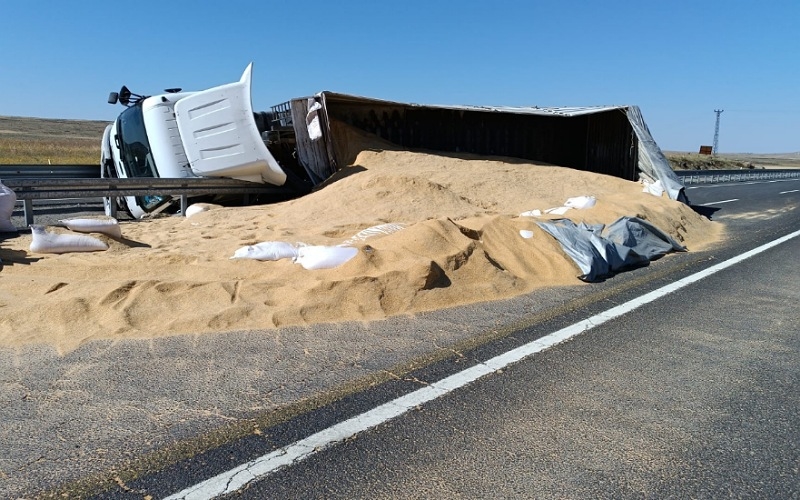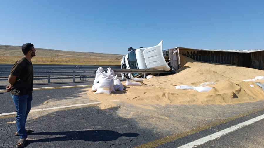 Gaziantep'ten Diyarbakır'a gelen mısır kepeği yüklü kamyon devrildi.