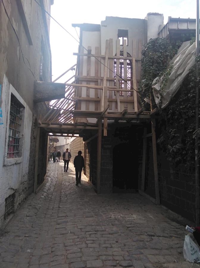 Diyarbakır’ın tarihi Sur İlçesi’nde bulunan Cahit Sıtkı Tarancı Müzesi’nde başlatılan tadilat nedeniyle sokakta kurulan iskele o bölgeyi güzergah olarak kullanan vatandaşları ürkütüyor.
