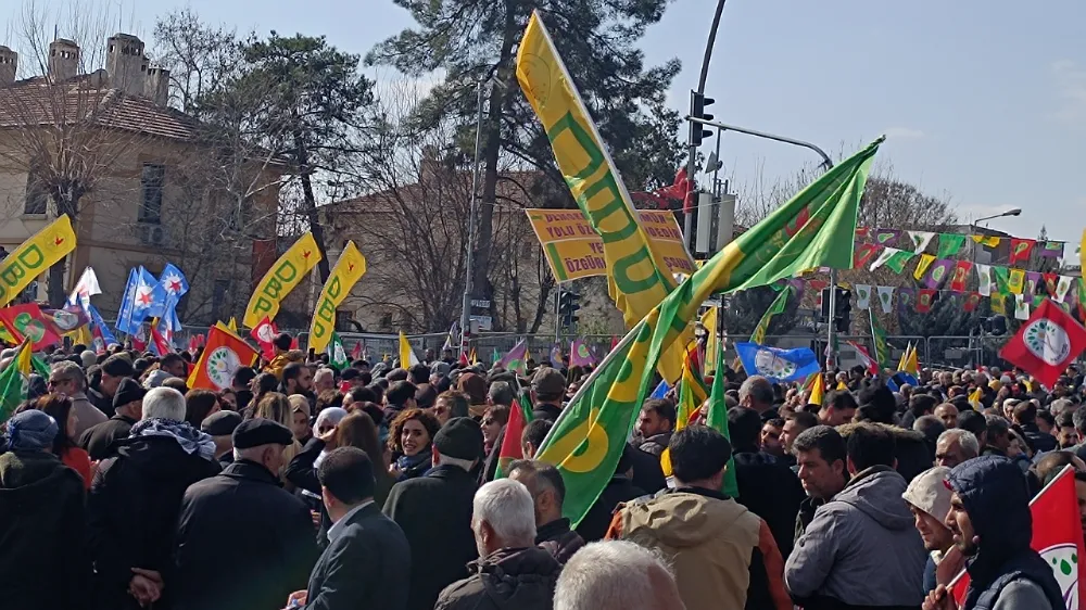 EMEK HABER- Diyarbakır'da, Halkların Eşitlik ve Demokrasi Partisi (DEM Parti) ve Demokratik Bölgeler Partisi (DBP) öncülüğünde düzenlenen Özgürlük ve Barış Mitingi İstasyon Meydanı'nda büyük bir katılımla başladı. Binlerce kişi, barış ve özgürlük çağrısında bulunmak üzere alanı doldurdu.