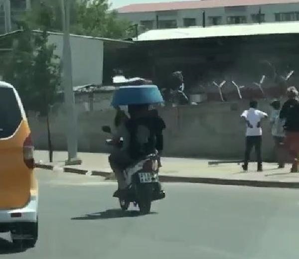 Öte yandan sıcaklığın 48 derece olduğu kentte, Bağlar ilçesi Çevlik Caddesi üzerinde sürücüsünün ismi ve plakası öğrenilmeyen motosiklette oturan iki kişi güneşten korunmak için leğeni üzerine tuttu. Leğenle gölge yapan motosiklet üzerindeki iki kişinin bu şekilde yolculuk yapması ise cep telefonu kamerasına yansıdı.(DHA)