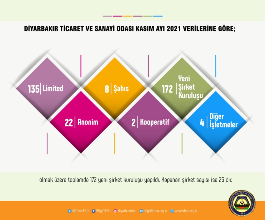 Diyarbakır Ticaret ve Sanayi Odası (DTSO), 2021 Kasım ayı verilerini açıkladı. DTSO'nun açıkladığı verilere göre Diyarbakır'da, 172 yeni şirket kuruluşu yapılırken, devamlılığını sağlayamayarak kapanan şirket sayısı ise 26 olarak belirlendi.