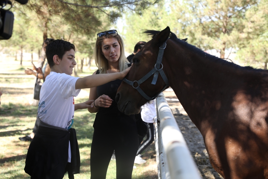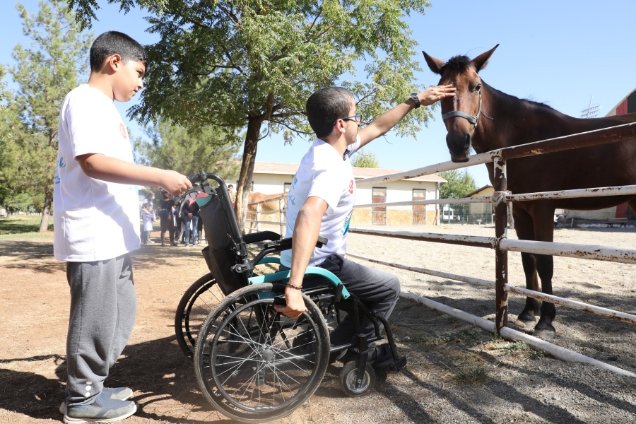 Görevliler eşliğinde alanı gezen engelli bireyler ve aileleri atları sevip elleriyle besledikten sonra at binme alanına geçti.