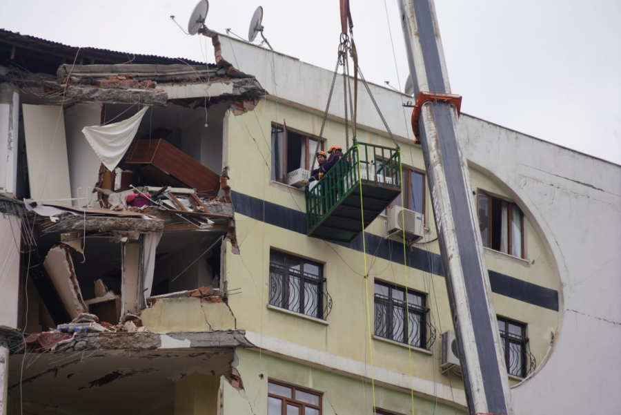 Bu kapsamda merkez Yenişehir ilçesinde Galeria İş Merkezi ve üstündeki sitede arama kurtarma çalışmalarının tamamlanmasının ardından kontrollü şekilde başlayan yıkım, içeride bir kedinin olduğunun belirlenmesi üzerine durduruldu.