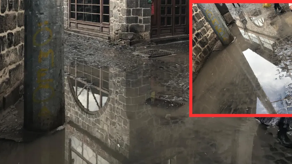 Diyarbakır'ın Sur ilçesinde bulunan ve her gün yüzlerce turisti ağırlayan Ulu Camii'nin bulunduğu Camikebir Mahallesi Pirinçiler Sokak, bugün etkili olan yağmurla birlikte göle döndü.