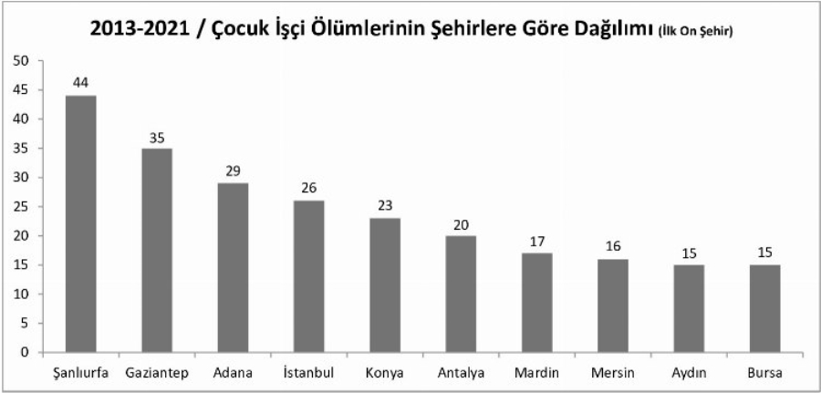 Türkiye’nin 75 şehrinde iş cinayeti gerçekleştiğini tespit edildiği belirtilen raporda; 44 ölüm Şanlıurfa’da; 35 ölüm Gaziantep’te; 29 ölüm Adana’da; 26 ölüm İstanbul’da; 23 ölüm Konya’da; 20 ölüm Antalya’da; 17 ölüm Mardin’de; 16 ölüm Mersin’de; 15’er ölüm Aydın ve Bursa’da olduğu kaydedildi.