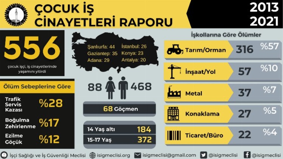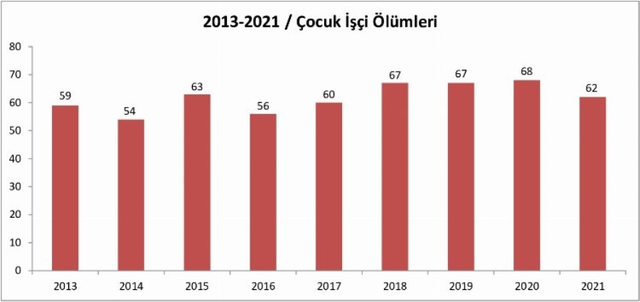 İşçi Sağlığı ve İş Güvenliği (İSİG) Meclisi verilerine göre 2021 yılında Türkiye'de en az 62 çocuk, çalışırken hayatını kaybetti.