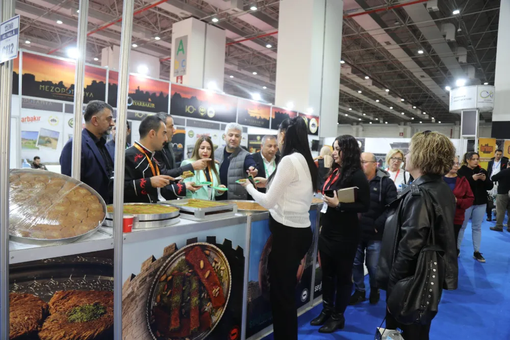 Dünyanın en önemli turizm fuarlarından biri olan 17. Travel Turkey İzmir Fuarı’na çıkarma yapan Diyarbakır Ticaret ve Sanayi Odası (DTSO) ile Diyarbakır Ticaret Borsası’nın (DTB) ziyaretçilere Diyarbakır Coğrafi İşaretli Ürünü Kadayıf ikram edildi.