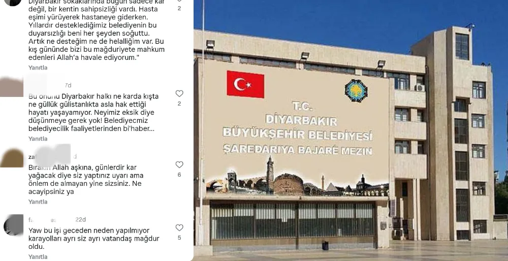 Yapılan yorumlarda çok sayıda yurttaş, kar yağışının günler öncesinden meteoroloji tarafından duyurulduğunu hatırlatarak, belediyenin yeterli önlem almadığını savundu. Bir başka vatandaş ise, “Bu onurlu Diyarbakır halkı ne karda kışta ne de güllük gülistanlıkta hak ettiği yaşam koşullarına ulaşabiliyor. Belediyeciler belediyecilikten bihaber” ifadeleriyle tepkisini dile getirdi.