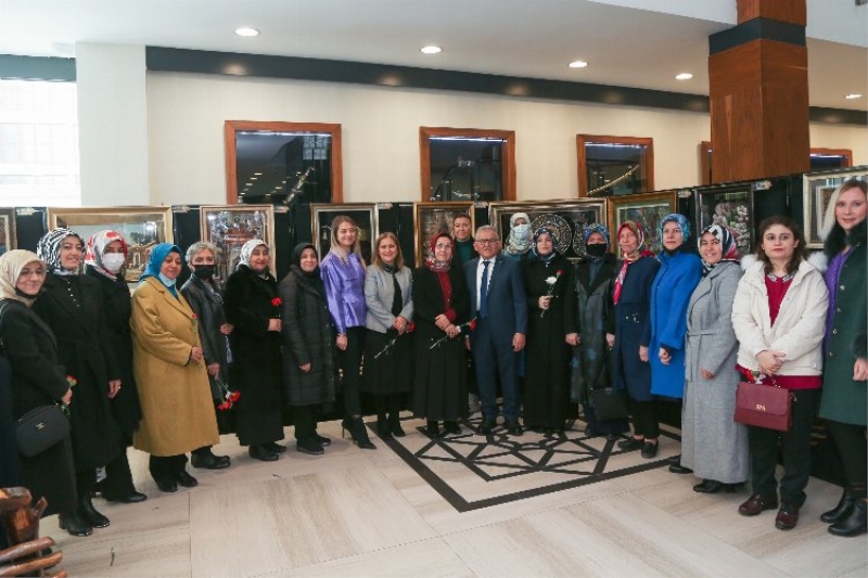 Kayseri Büyükşehir Belediye Başkanı Dr. Memduh Büyükkılıç, eşi Dr. Necmiye Büyükkılıç, AK Parti Kayseri Milletvekili Hülya Nergis ve kadınlarla, KAYMEK tarafından 8 Mart Dünya Kadınlar Günü’ne özel hazırlanan ‘Kâğıt Boyut Sanat Rölyef Sergisi’nin açılışını yaptı. Başkan Büyükkılıç, belediyede görevli kadın personele öğleden sonra izin verdiklerini duyurdu.