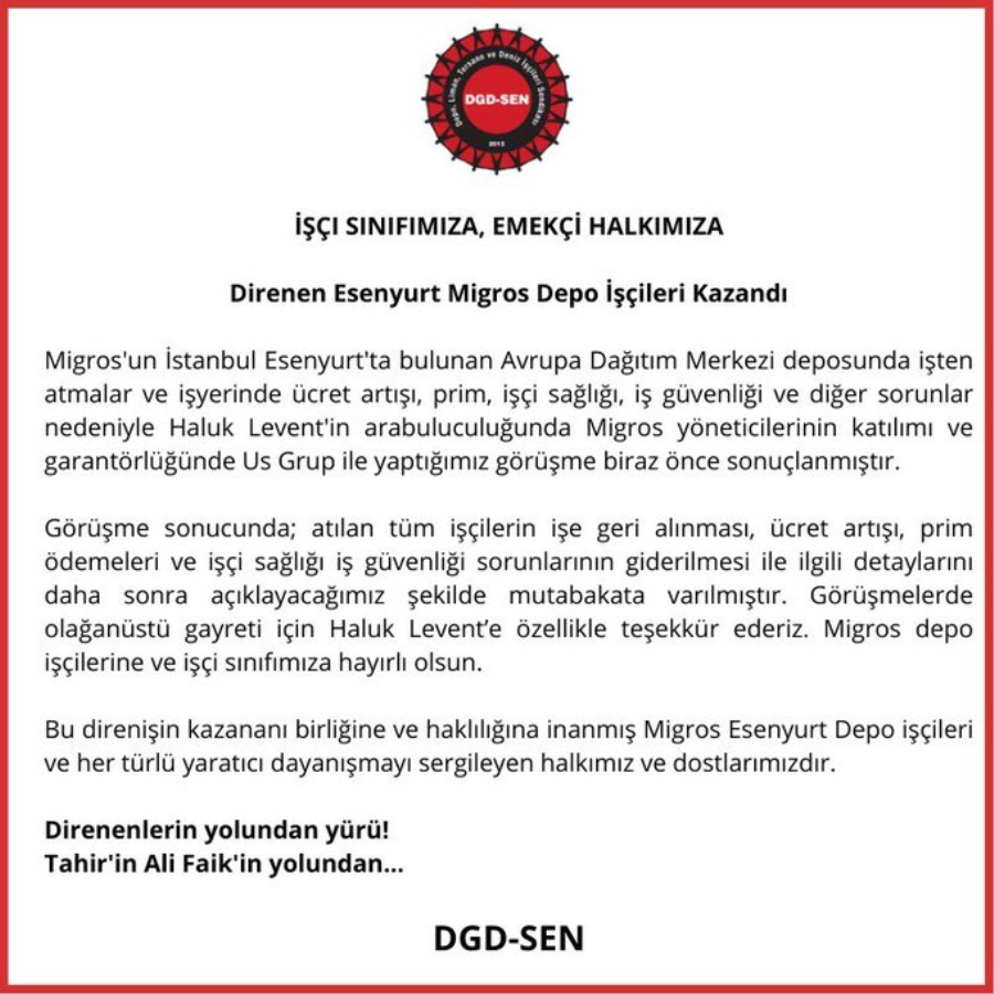 Yayınlanan yazıda " Bu direnişin kazananı birliğine ve haklılığına inanmış Migros Esenyurt depo işçileri ve her türlü yaratıcı dayanışmayı sergileyen halkımız ve dostlarımızdır." ifadelerine yer verildi.