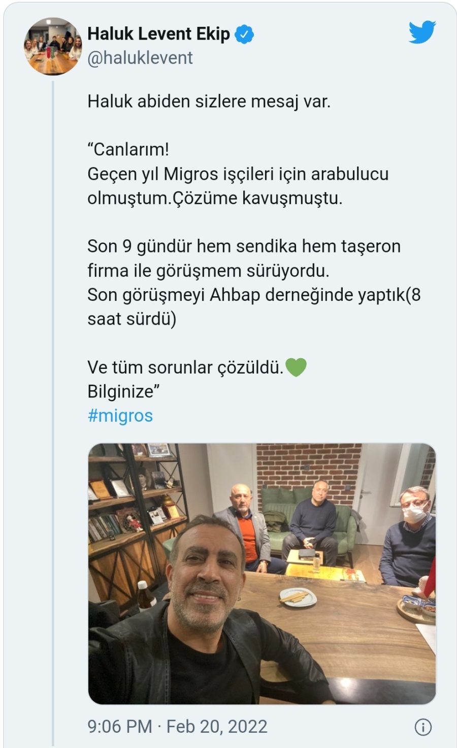 Konu ile ilgili ilk açıklamayı Twitter hesabından yapan Ahbap platformu başkanı ve sanatçı Haluk Levent, "Canlarım! Geçen yıl Migros işçileri için arabulucu olmuştum. Çözüme kavuşmuştu. Son 9 gündür hem sendika hem taşeron firma ile görüşmem sürüyordu. Son görüşmeyi ahbap derneğinde yaptık. (8 saat sürdü) ve tüm sorunlar çözüldü. Bilginize" ifadelerini kullandı.
