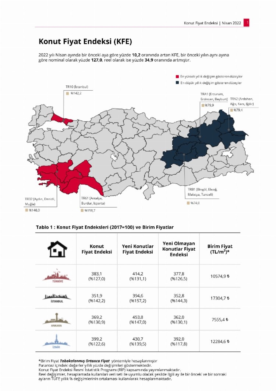 Buna göre konut fiyatları bir önceki yılın aynı ayına göre yüzde 127 arttı. İstanbul, Ankara ve İzmir’de bu artışlar sırasıyla yüzde 142,2, 130,9 ve 122,6 oldu.