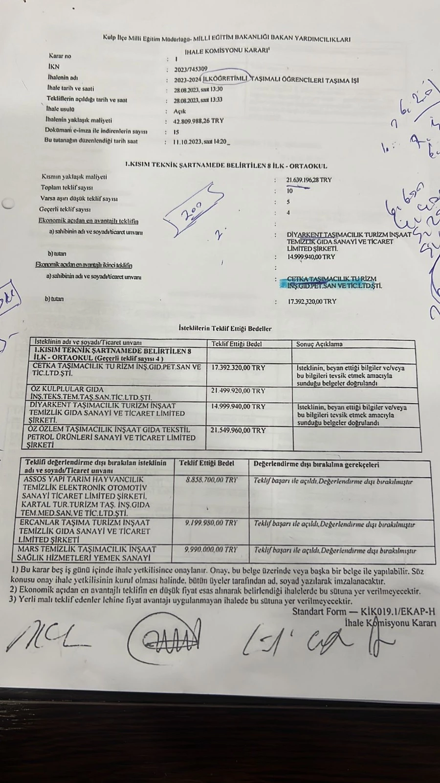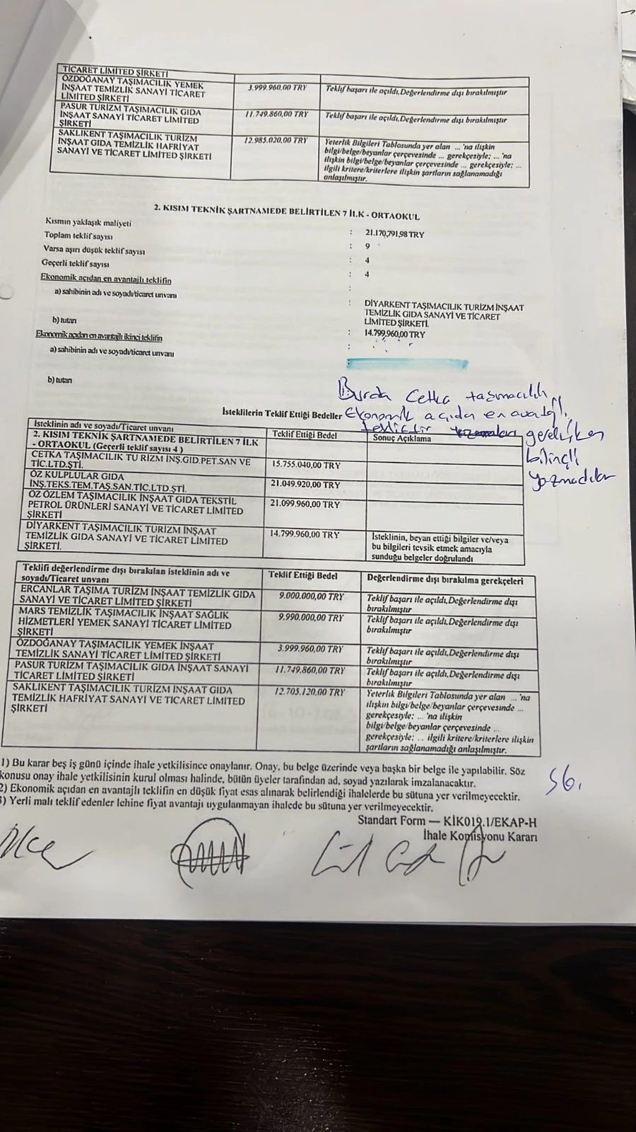 Kamu zararına neden olan usulsüzlüklerin devam etmemesi adına ihaleye girdiğini dile getiren Taş, “Elbette yapılan haksızlığa karşı sesiz kalamazdım. Bu haksızlıklara karşı sesiz kalmam hukuka aykırı ve kamu zararına neden olan usulsüzlüklerin devam etmesi anlamına gelecekti. İhaleye girme yeterliliği olan akrabamıza ait CETKA TAŞIMACILIK isimli firma ile ortaklık kurmak suretiyle Taşıma işi ihalesine girme kararı aldım. 4 kısımdan ibaret olan ihaleye İlkokul 1. Kısım ile Ortaokul 1. Kısım için teklif kullandım. Diğer iki kısım için ise istekli olmadık. Teklif vermiş olduğumuz kısımlara ilişkin tüm teklifler EKAP sistemine düşürüldükten sonra tüm teklifleri inceleme imkânım oldu. EKAP formülüne göre yapmış olduğumuz hesaplamayla sınır değeri tespit ettim. İlkokul 1. Kısımda sınır değer üstünde en avantajlı teklifin CETKA TAŞIMACILIĞA ait olduğunu tespit ettim. Ortaokul 1. Kısımda ise CETKA TAŞIMACILIK sınır değerin altında, sınır değere en yakın teklifi veren firma olduğu tarafımızca tespit edildi. İhale yaklaşık maliyeti 12.745.523,88 TL iken firmamız 8.870.400,00 şeklinde teklifte bulunmuş, idarenin yaklaşık 4.000.000,00 TL kara geçmesini sağlamıştır” dedi.