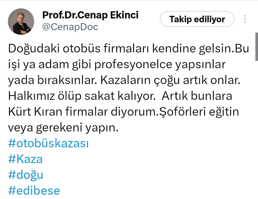 EMEK HABER- Kazanın ardından Diyarbakırlı Prof. Dr. Cenap Ekinci, sosyal medya platformu X'ten yaptığı açıklamada, doğudaki otobüs firmalarına sert eleştirilerde bulundu. Ekinci, "Doğudaki otobüs firmaları kendine gelsin. Bu işi ya adam gibi profesyonelce yapsınlar ya da bıraksınlar. Kazaların çoğu artık onlar. Halkımız ölüp sakat kalıyor. Artık bunlara Kürt Kıran firmalar diyorum. Şoförleri eğitin veya gerekeni yapın." ifadelerini kullanarak firmaları sert bir şekilde eleştirdi.