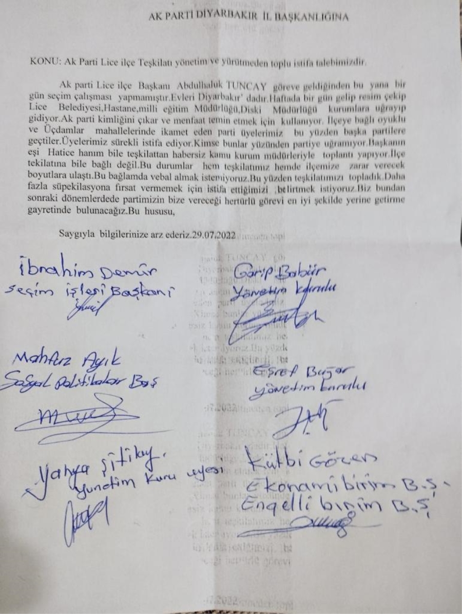 29 Temmuz tarihli dilekçede, şu ifadeler yer aldı: “AK Parti Lice İlçe Başkanı Abdulhaluk TUNCAY göreve geldiğinden bu yana bir gün seçim çalışması yapmamıştır. Evleri Diyarbakır'dadır. Haftada bir gün gelip resim çekip Lice Belediyesi, hastane, Milli Eğitim Müdürlüğü, DİSKİ Müdürlüğü, kurumlara uğrayıp gidiyor. AK Parti kimliğini çıkar ve menfaat temin etmek için kullanıyor. İlçeye bağlı Oyuklu ve Üçdamlar mahallelerinde ikamet eden parti üyelerimiz bu yüzden başka partilere geçtiler. Üyelerimiz sürekli istifa ediyor. Kimse bunlar yüzünden partiye uğramıyor. Başkanın eşi Hatice hanım bile teşkilattan habersiz kamu kurum müdürleriyle toplantı yapıyor. İlçe teşkilatına bile bağlı değil. Bu durumlar hem teşkilatımız hem de ilçemize zarar verecek boyutlara ulaştı. Bu bağlamda vebal almak istemiyoruz. Bu yüzden teşkilatımızı topladık. Daha fazla spekülasyona fırsat vermemek için istifa ettiğimizi belirtmek istiyoruz. Biz bundan sonraki dönemlerde de partimizin bize vereceği her türlü görevi en iyi şekilde yerine getirme gayretinde bulunacağız.”