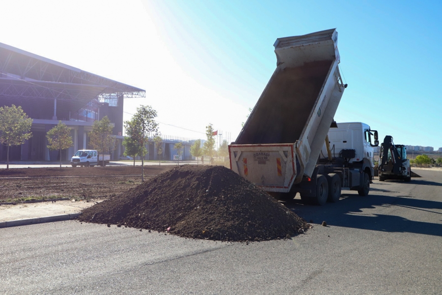 Ekipler, çevresel etmenlerle aşınmış olan çim alanları rehabilite etmek üzere zemini tesviye etmeye devam ediyor. Tesviye edilen toprak zemine daha sonra çimlendirme çalışmaları yapılacak.