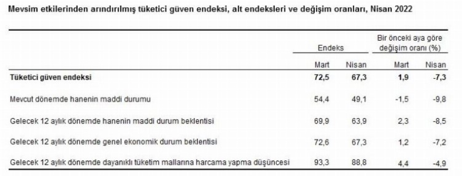 Türkiye İstatistik Kurumu ve Türkiye Cumhuriyet Merkez Bankası işbirliği ile yürütülen tüketici eğilim anketi sonuçlarından hesaplanan mevsim etkilerinden arındırılmış Tüketici Güven Endeksi, Nisan ayında bir önceki aya göre yüzde 7,3 oranında azaldı.