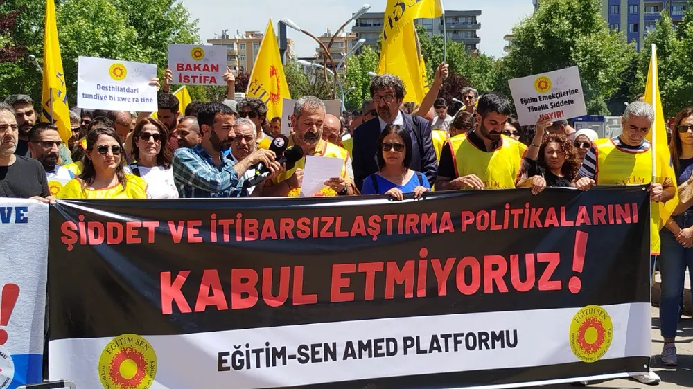 Burada açıklama yapan Amed Eğitim-Sen 1 Nolu Şube Eş Başkanı Faruk Ercan, "Millî Eğitim Bakanlığı ve siyasi iktidarın eğitim emekçilerine yönelik söylem ve yaklaşımları ile Öğretmenlik Meslek Kanunu üzerinden itibarsızlaştırdığı mesleğimizin emeğimizin değersizleştirildiği koşullarda, savaşlarda bile hedef alınmayan eğitim emekçileri okullarda şiddetin hedefi olmaya devam etmektedir. Önceki gün ömrünün büyük bölümünü eğitime ve öğrencilerine adamış olan bir meslektaşımızı hayattan ve öğrencilerinden koparan ne basit bir öfke krizi ne failin öğrenci oluşu ne de failin uyruğu ile ilgilidir. Bugüne kadar eğitimden sorumlu olanların yaptıkları açıklamalarda eğitimde yaşanan olumsuzlukların sorumlusu olarak öğretmenleri bir göstermesi, CİMER uygulamasının bizlere karşı sopaya dönüştürülmesi, MEB'in eğitimde yaşanan sorunlara çözüm üretmek yerine öğretmenleri ve idarecileri veli/öğrenci karşısında tek muhatap olarak bırakması, bugün yaşananlara zemin oluşturmuştur" dedi.