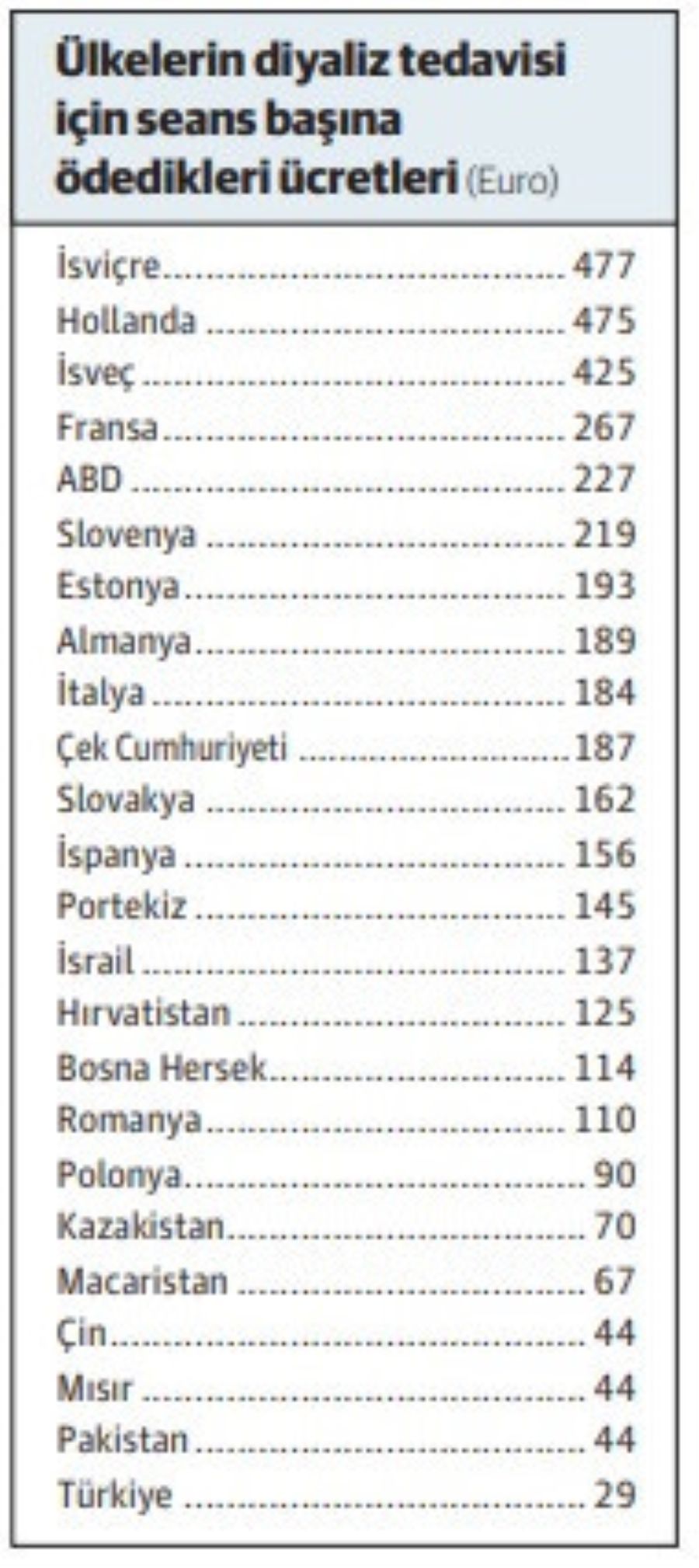 Aşağıda bazı ülkelerin diyaliz tedavisi için seans başına ödedikleri ücretleri paylaşmak isterdim. (Ücretler Euro cinsinden ödenmektedir.)