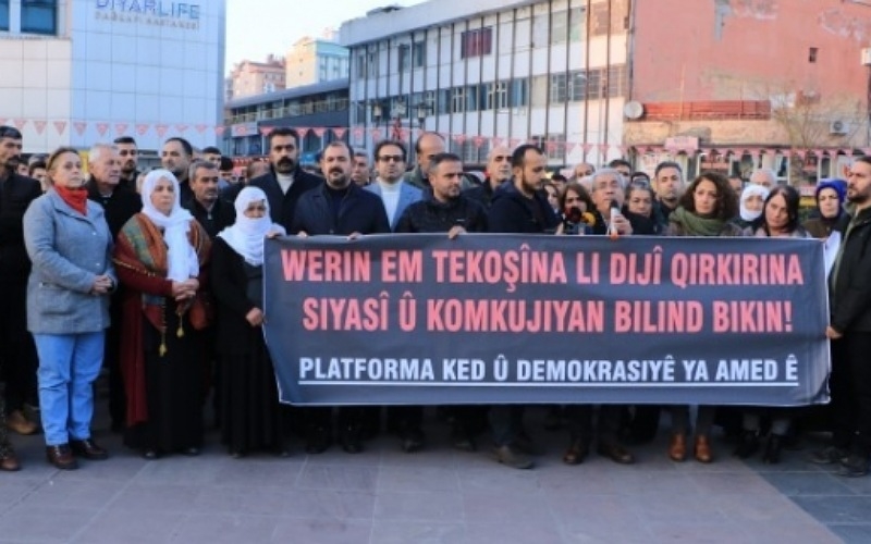 Amed Emek ve Demokrasi Platformu, Demokratik Bölgeler Partisi (DBP) Eş Genel Başkanı Keskin Bayındır ve yöneticilerin gözaltına alınmasına ve Paris’ te Ahmet Kaya Kültür Merkezi’ne yapılan saldırıya ilişkin Dağkapı Meydanı’nda açıklama yaptı.