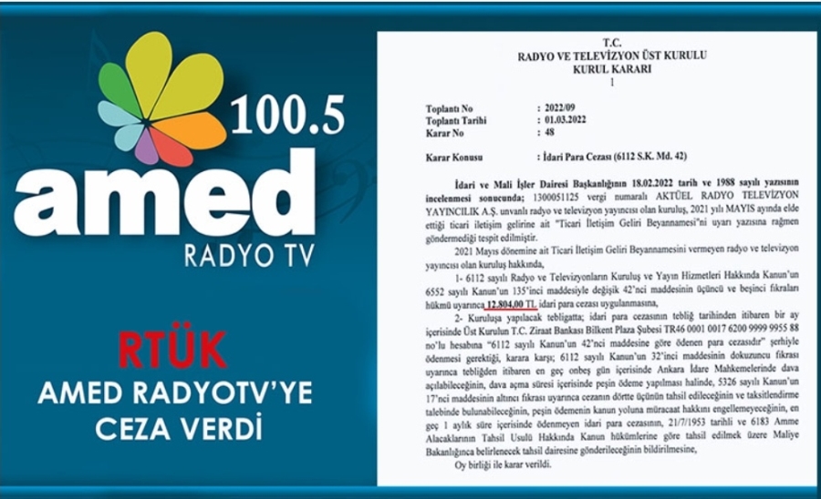 Radyo Televizyon Üst Kurulu Diyarbakır'da karasal yayın yapan AMED Radyo Tv'ye 12804₺ para cezası verdi.