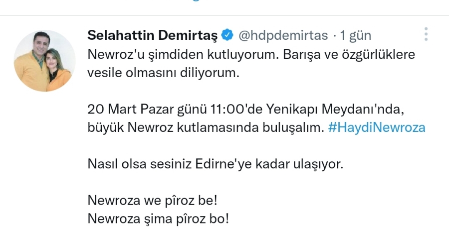 "Newroz'u şimdiden kutluyorum. Barışa ve özgürlüklere vesile olmasını diliyorum. 20 Mart Pazar günü 11:00'de Yenikapı Meydanı'nda, büyük Newroz kutlamasında buluşalım. #HaydiNewroza Nasıl olsa sesiniz Edirne'ye kadar ulaşıyor. Newroza we pîroz be! Newroza şima pîroz bo!"