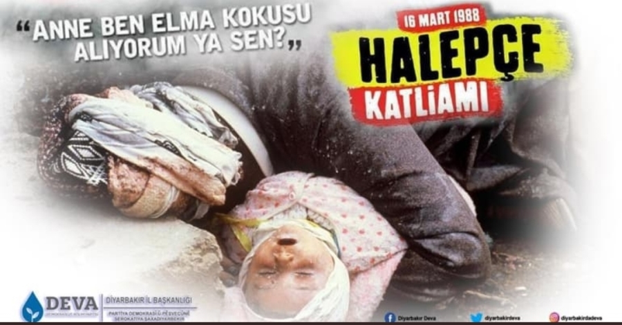 Deva Partisi Diyarbakır İl Başkanlığı olarak; binlerce insanın yaşam hakkının ihlal edildiği Halepçe katliamının 34. yıldönümünde bir kez daha Halepçe özelinde insanlığa bu acıları yaşatanları kınıyoruz. Bütün insanlık tarafından lanetlenmesi gereken Halepçe Soykırımını unutmayacağız, Unutturmayacağız!”
