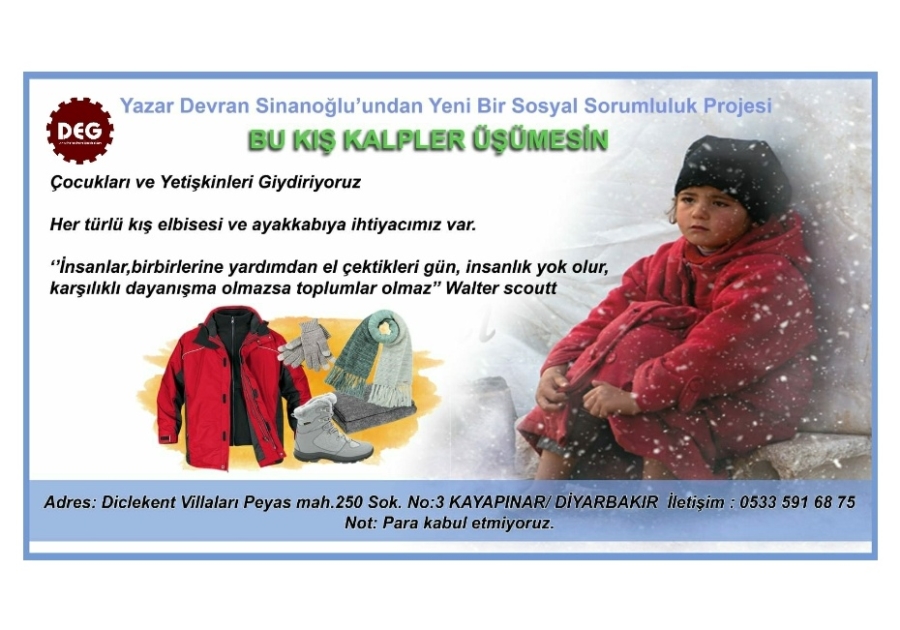 Yazar&şair Devran Sinanoğlu'nun başlatmış olduğu "BU KIŞ KALPLER ÜŞÜMESİN" sosyal sorumluluk projesi kapsamında Diyarbakır'da giyecek ihtiyacı olan kişilere ulaşıyorlar.