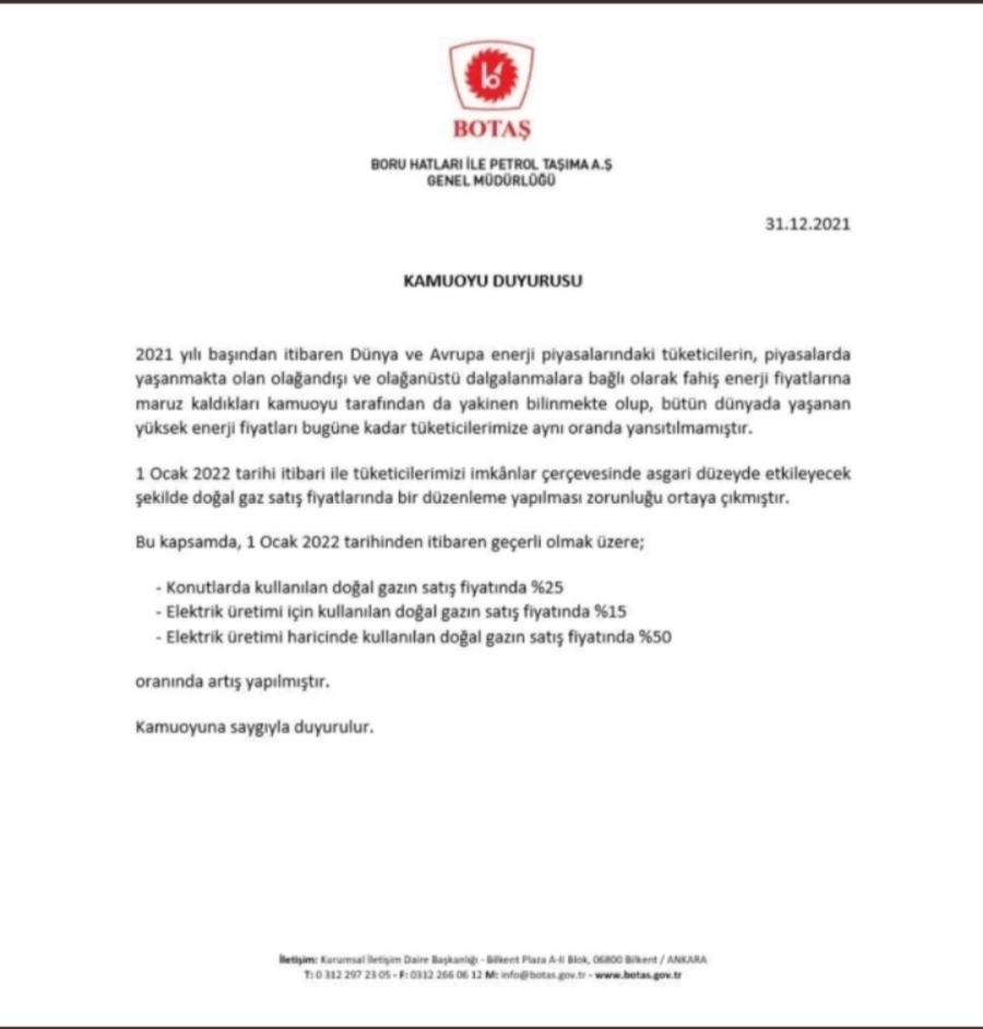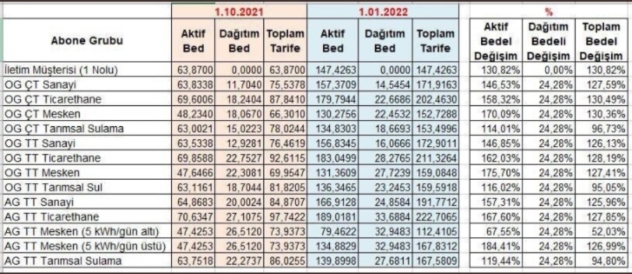 Türkiye, 2022'ye elektrik ve doğal gaz için yapılan yeni zamlarla girdi. Yeni yılla birlikte elektrik faturalarında kademeli tarife sistemine geçilirken, elektrik faturalarının iki tarifeye ayrıldığı sistemde, fiyatlara yüzde 50 ile yüzde 125 arası zam yapıldı. Öte yandan doğal gazda ise konutlarda kullanılan yüzde 25, büyük sanayi ve ticari kuruluşlara sağlanan yüzde 50 ve elektrik üretim amaçlı kullanılana ise yüzde 15 zam yapıldı.