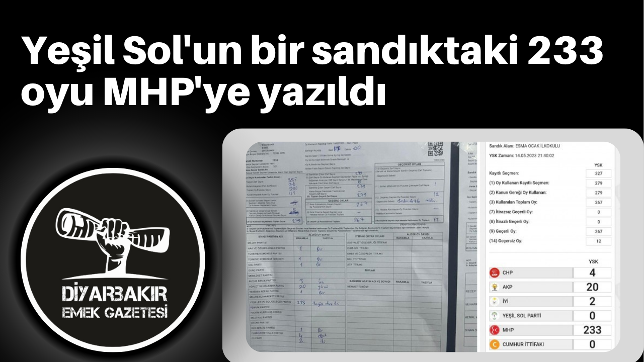 Yeşiller ve Sol Gelecek Partisi (Yeşil Sol Parti), Diyarbakır'ın Bismîl ilçesinde bulunan Esma Ocak İlkokulu'ndaki 1234 Nolu sandıkta geçerli oylardan 233'ünü alarak, sandıktan birinci parti çıktı. 279 seçmenin oy kullandığı söz konusu sandıkta, Hak ve Özgürlükler Partisi'ne, Türkiye Komünist Hareketi'ne, Yeniden Refah Partisi'ne, Güç Birliği Partisi'ne ve Sol Parti'ye birer oy; İYİ Parti'ye 2 oy; Büyük Birlik Partisi'ne 3 oy; Cumhuriyet Halk Partisi'ne 4 oy; AKP'ye 20 oy; Yeşiller ve Sol Gelecek Partisi'ne 233 oy çıktı. Milliyetçi Hareket Partisi'ne hiç oyun çıkmadığı sandıkta 12 oy ise geçersiz sayıldı. Oylar, ıslak imzayla tutanak altına alındı. Yeşil Sol Parti, 233 oylarının, o sandıktan hiç oy alamayan MHP'nin hanesine yazıldığını tespit etti. Halkların Demokratik Partisi (HDP) Diyarbakır İl Eşbaşkanı Gülistan Atasoy, konuya dair şu açıklamayı yaptı: “Bu şekilde MHP'ye oy kaydıran epeyce sandık var, tüm ıslak imzalı tutanaklar ile YSK veri sistemine kayıtlı tutanaklar karşılaştırıldı ve bugün itirazlar yapılacak.” Kaynak: MA