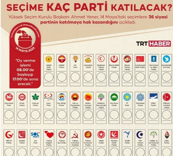 Yüksek Seçim Kurulu (YSK), 14 Mayıs'ta yapılacak seçime 36 siyasi partinin katılacağını bildirdi. YSK, oy verme saatlerinin ise 08.00-17.00 arası olacağını duyurdu.